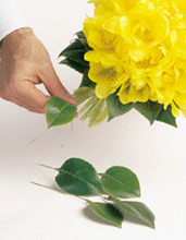 - Z przygotowanych wcześniej liści kamelii zrób otoczkę bukietu